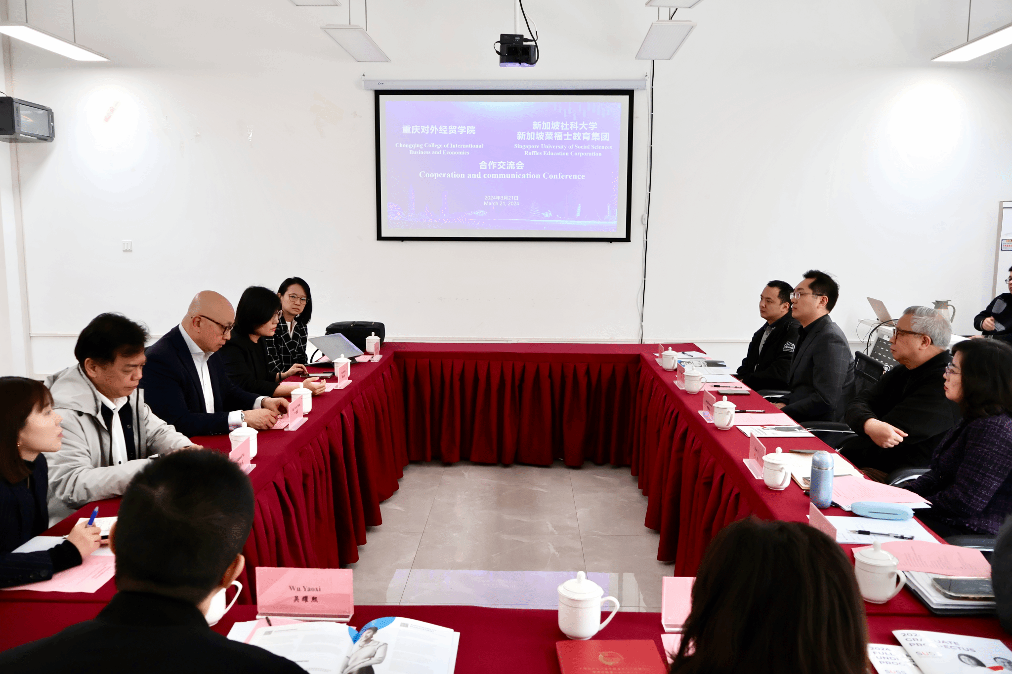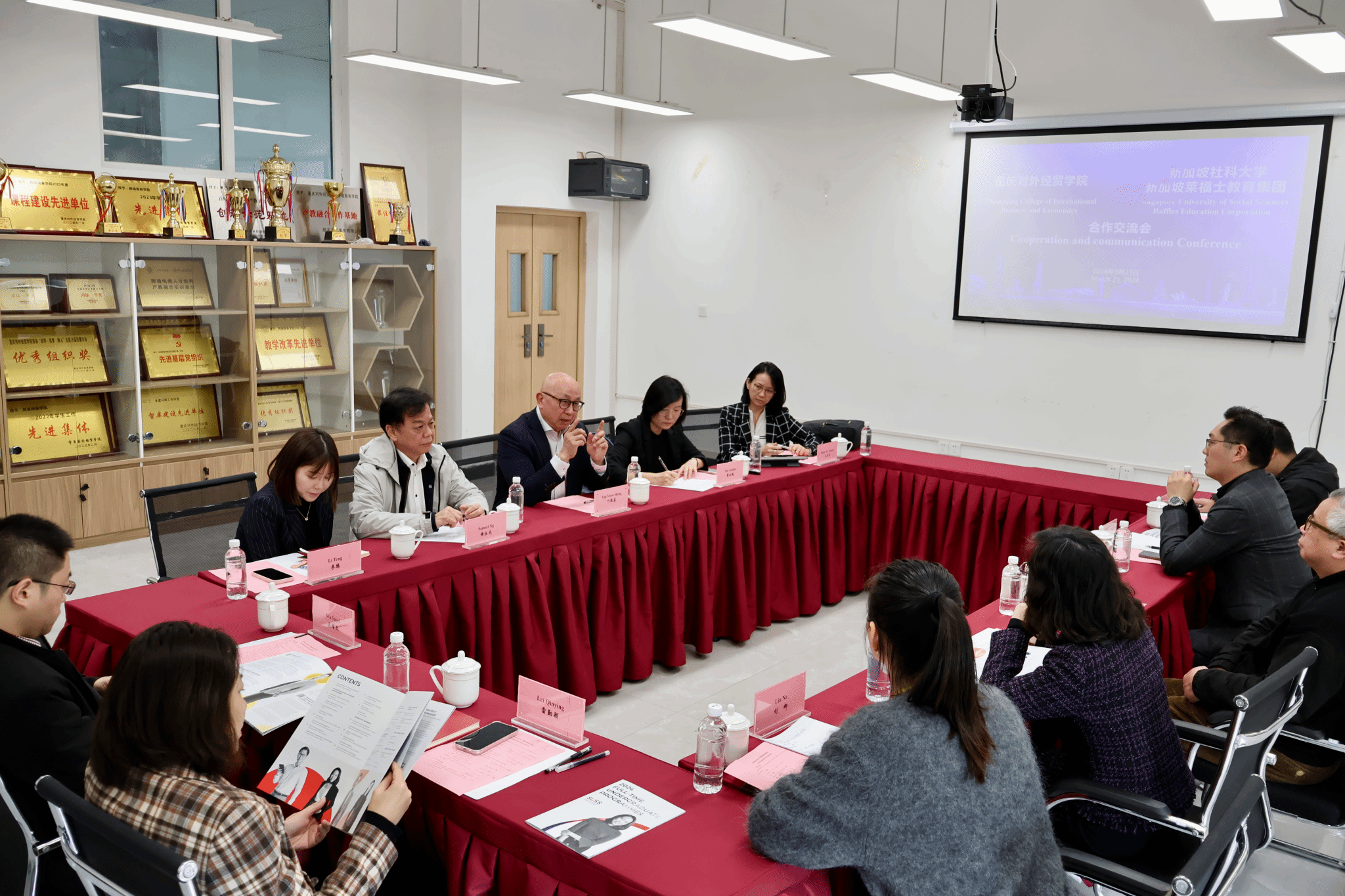 3月21日,蒋满元副校长在跨境商务学院会见了来访的新加坡社科大学学生成就中心院长叶敏盛博士和新加坡莱福士教育集团董事长黄壮龙先生一行。跨境商务学院院长赵逖、学前教育学院院长刘娜、外语外贸学院副院长吴耀熙、大数据与智能工程学院副院长唐士、管理学院副院长雷勤颖、国际交流合作处处长刘用等出席。